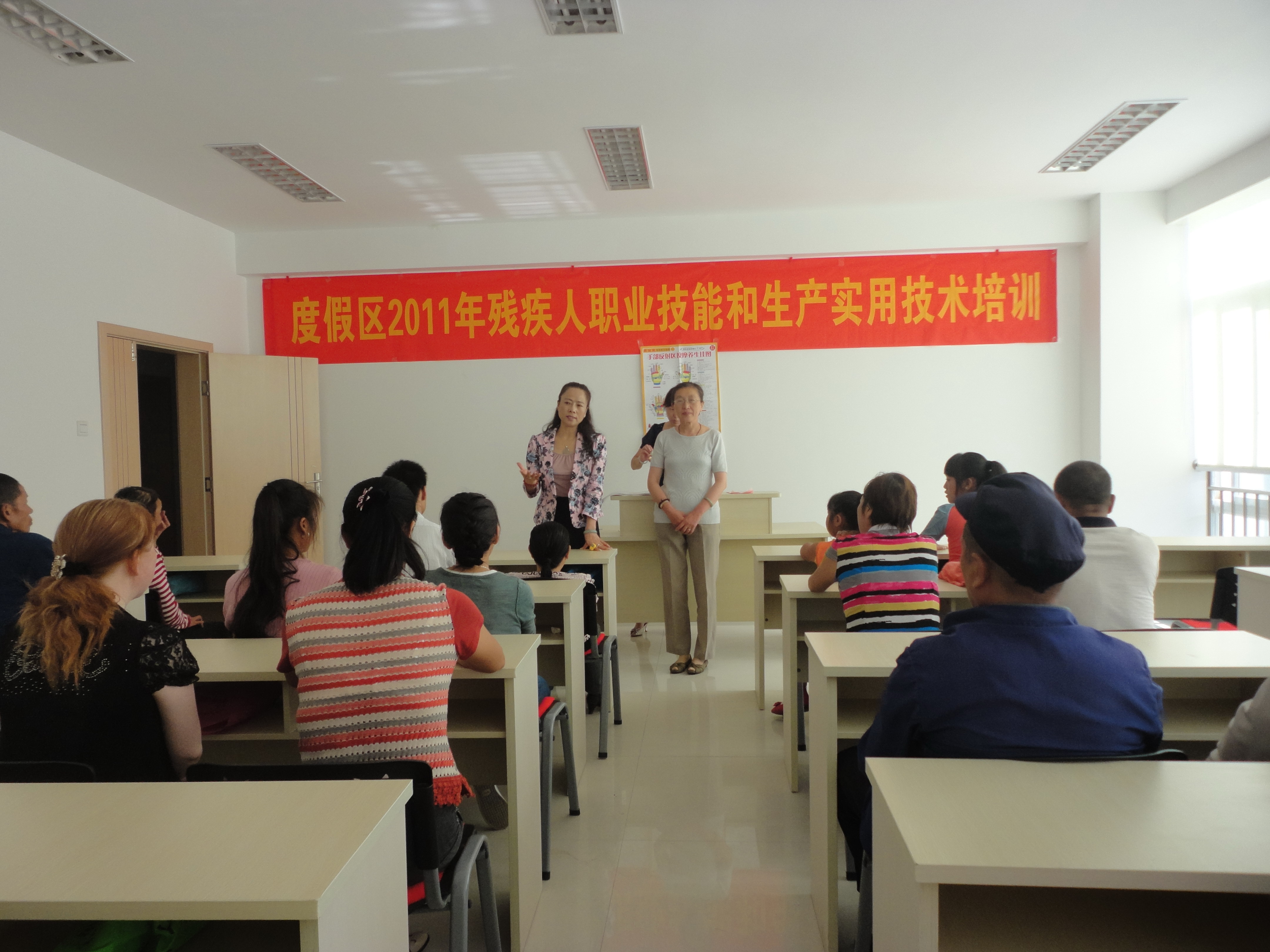 在度假区轰轰烈烈开展学习杨善州,共建善洲林,全区上下一心、凝心聚力、攻坚克难,共建和谐度假区的热潮中,为了使广大残疾朋友掌握一技之长,提高生活质量,增强感恩、健康、快乐、阳光生活的信念,幸福的融入和谐度假区氛围。2011年8月18日,度假区残联在海埂街道金河养老服务中心举办残疾人按摩技术培训,经过动员筛选,共20名双手健康,智力、精神正常,对按摩技术感兴趣的残疾人参加培训。