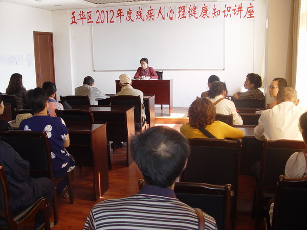 为充分发挥残疾人心理咨询日作用,增强残疾人心理健康意识,2012年4月24日上午,区残疾人便民服务暨援助中心举办“2012年度残疾人心理健康知识讲座”,邀请昆明市精神病院李凡医生主讲,龙翔、莲华办事处残联理事长、社区残协专职委员及辖区残疾人共50人参加了此次知识讲座。