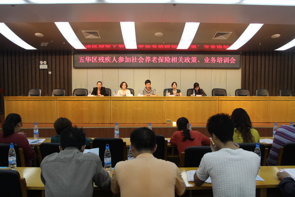 7月6日上午,五华区残联在区政府四楼中型报告厅召开新型农村社会养老保险和城镇居民养老保险业务培训大会。参加培训的有区属各街道办事处分管副主任、残联理事长和社区专职委员共100余人。区残联理事长黄兴发、副理事长曾庆上及区城乡居民社会养老保险中心主任庄新泉参加了会议,会议由五华区残疾人便民服务暨援助中心主任黄洪明主持。