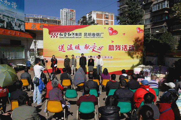 残疾朋友们很早就来到捐赠地点翘首以待,下午2:00活动正式开始。石副区长首先作了致辞,她说,红云红河集团昆明卷烟厂作为全国一流的大型国有企业,长期以来积极投身社会公益事业,并十分关心、关注和支持五华区残疾人事业的发展。这次携手五华区残疾人联合会开展红云红河集团昆明卷烟厂“送温暖、献爱心”助残活动,就是以自己的实际行动践行感恩、博爱、和谐、超越的人文精神,让更多的企事业单位、团体和个人关注残疾人事业,切实帮助残疾人解决实实在在的困难和问题。随后红云红河集团昆明卷烟厂杨副厂长的讲话也道出了举办此次捐赠活动的初衷:扶助弱势群体,构建和谐社会;弘扬人道主义,倡导助残风尚。