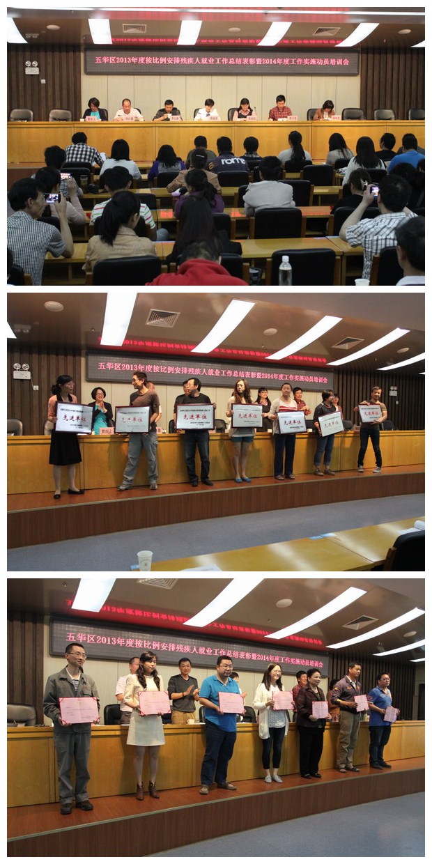 2014年4月16日下午,五华区在区政府行政中心四楼中型报告厅召开2013年度按比例安排残疾人就业工作表彰暨2014年度工作实施动员培训会。昆明市残疾人劳动就业服务中心主任李晓阳到会指导,区政府副区长、区政府残疾人工作委员会主任期丽琼,区财政局、区人力资源和社会保障局、区地方税务局、区残联等相关部门的领导和辖区10家街道办事处副主任、残联理事长、社区残协专职委员,及受表彰的先进单位、先进个人代表共196人参加了会议。会议由区残联副理事长曾庆上主持。