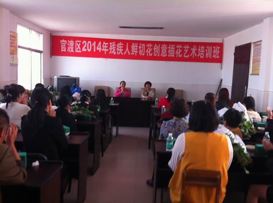 官渡区残疾人“鲜切花创意插花艺术培训班”在矣六街道顺利举办,共有60名残疾人参加培训。
