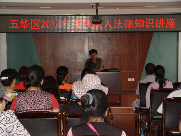 2014年6月5日是五华区残疾人法律援助日,为增强法律援助日的实效,区残疾人便民服务暨援助中心联合区司法局举办了“2014年度残疾人法律知识讲座”,邀请云南省圣唐律师事务所的张建华主任主讲,莲华、普吉办事处的52名残疾人工作者及辖区残疾人参加此次讲座。