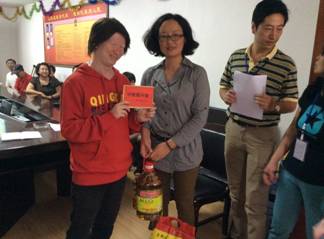 图为:官渡区残联理事长(支部书记)给残疾人发放慰问品