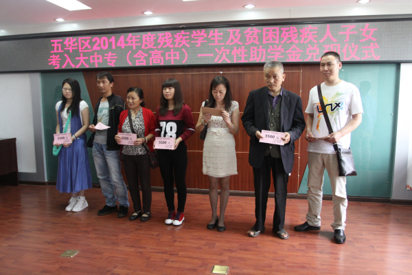 为帮助残疾学子及贫困残疾人子女顺利完成学业,9月5日上午,五华区残联举行了2014年度残疾学生及贫困残疾人子女考入大中专(含高中)一次性助学金发放仪式,为首批24名贫困学子献上一份爱心,送上一份真情。区残联理事长黄兴发、、副理事长曾庆上出席仪式并为受资助学生发放助学金,残疾人便民服务中心主任黄洪明主持发放仪式。