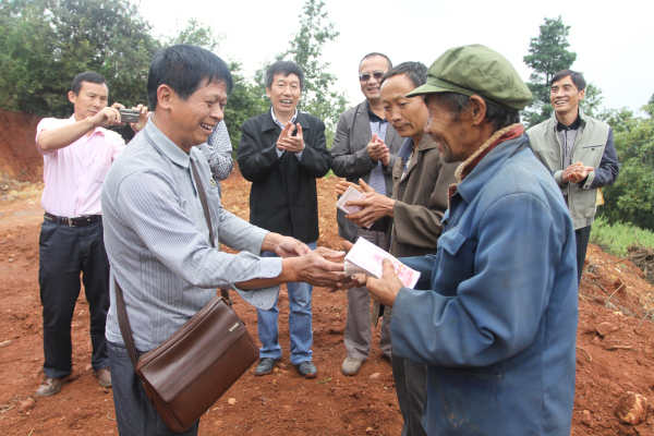 区残联在了解到张绍华老人家的情况后,及时与西翥办事处残联深入老人家中进行实地调研,并按照相关规定和程序很快为潘美孝办理了残疾证。同时多方协调,为老人在所属村小组内申请了一块150平米的宅基地用于建盖住房,并协调了近3亩的耕地给老人。离村近了,宅基地有了,但建盖房屋所需的3.2万元资金又成了这个一贫如洗的家庭面临的最大困难。区残联再次主动和社区、区民政局协调,为老人争取到了1.2万元的补助资金,还剩的2万元又该到什么地方筹集?这是摆在所有人面前的难题。区残联黄兴发理事长急残疾人所急,积极联系辖区几家企业,希望得到他们的帮助。五华区滇鑫塑料制品厂是一家福利企业,总经理何耀昌也是一名残疾人,当他听到黄理事长介绍张绍华老人家的情况后,立马答应剩下的2万元建房资金有他来捐助,由此有了这场特殊的捐赠。