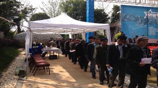 图为:听障人员正在排队调试助听器
