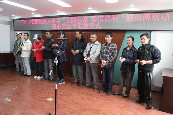 2014年10月16日下午,五华区贫困残疾人参与“美丽春城·清洁昆明”迎南博活动爱心奖励卡发放仪式在五华区残联六楼会议室举行。部分获得爱心奖励卡的残疾人代表参加发放仪式,区残联曾庆上副理事长在仪式上作了讲话。