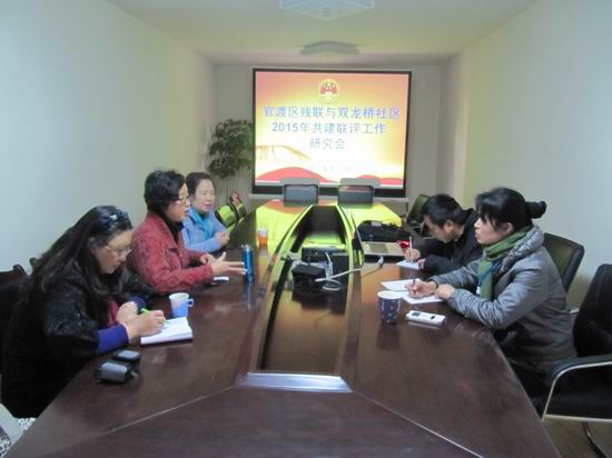 在区残联党支部和双龙桥社区党支部召开的共建联评工作会上,就提前谋划,结合实际,以进一步改进作风,便民惠民为主题,两个党组织认真研究了2015年开展基层党组织共建联评活动的工作计划和方案、春节前开展走访慰问困难残疾人家庭、老党员等具体内容和继续开展联系服务群众等内容;按照“三严三实,忠诚干净担当”教育活动的要求,对推进服务型党组织建设,党员双重管理、在职党员进社区、志愿者服务等工作进行了深入分析和研究。研究会上双龙桥社区党支部就正在开展的网格化管理体现、做成示范亮点体现出便民服务特色的工作,对社区在盘龙江边、老旧小区环境的文化长栏美化改造、社区8个网格楼院管理推进情况、党建电教室功能提升改造、社区手机移动党建平台建设、创新工作计划等进行了讨论交流。