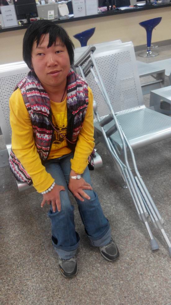 图为:残疾人领到的 拐杖