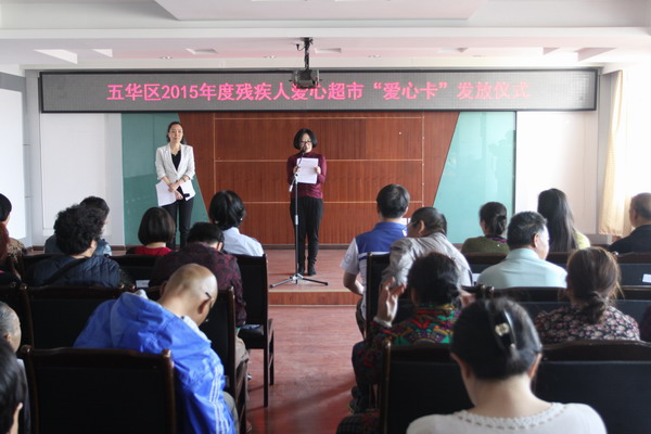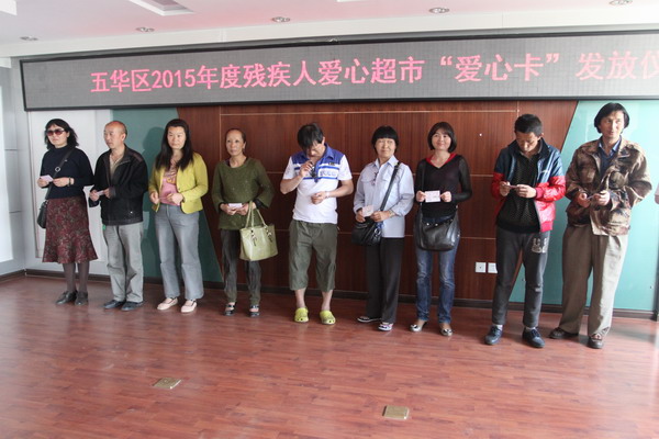 2015年3月18日下午,五华区残疾人联合会六楼会议室,龙翔办事处50名残疾人代表从区残联曾庆上副理事长手中接过“爱心卡”,脸上洋溢着幸福,这温馨感人的一幕出现在五华区2015年度残疾人爱心超市“爱心卡”发放仪式上。