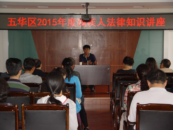 为了增强残疾人法律意识,保障和维护残疾人合法权益,2015年7月9日上午,昆明市五华区残疾人便民服务暨援助中心联合区司法局举办了“2015年度残疾人法律知识讲座”,邀请云南省圣唐律师事务所的张建华主任主讲,莲华、普吉办事处的53名残疾人工作者及辖区残疾人参加此次讲座。