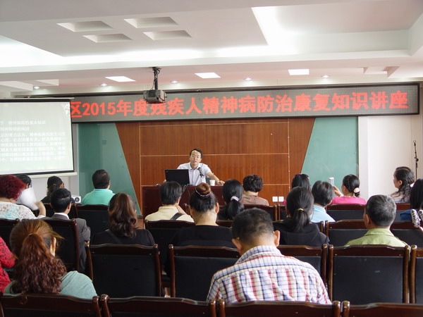为了提高精神病患者及家属对精神疾病防治和康复的认识,使精神患者及家属学到一些日常家庭护理常识,帮助精神病人家庭减轻心理压力,2015年7月16日上午,区残疾人便民服务暨援助中心举办“2015年度残疾人精神病防治康复知识讲座”,邀请昆明市精神病院张炳奎主任医师主讲,华山、黑林铺办事处的52名残疾人工作者、辖区精神残疾人及家属参加此次讲座。
