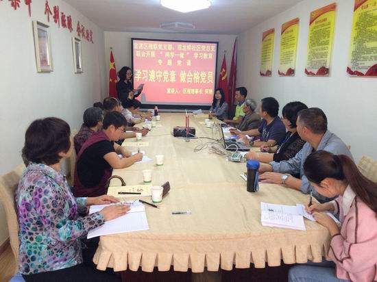 6月15日下午,区残联党支部全体在职党员到双龙桥社区,与双龙桥社区党总支党员共同开展6月党员固定日活动。在双龙桥社区会议室里,双龙桥社区党总支书记陈惠琼同志主持会议并讲话。首先提出了“两学一做”学习教育要落实到位,做合格党员要体现在党员先锋模范方面的具体要求;二是学习《中国共产党章程》、《中国共产党廉洁自律准则》、《中国共产党纪律处分条例》;三是区残联党支部书记(理事长)何艳同志讲党课,题目是《学习遵守党章 做合格党员》;四是全体参加学习的党员进行了“两学一做”学习教育知识测试;五是区残联党支部书记何艳同志与社区老党员和部分群众谈话,进行大下接访,大接访接待群众并所取意见建议。
