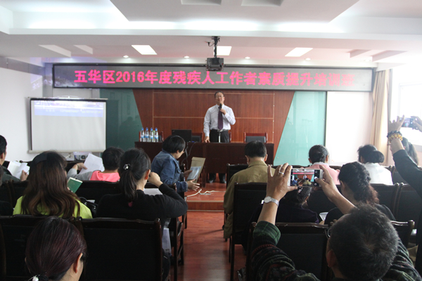 为加强残疾人基层组织建设,进一步提升我区残疾人工作者综合素质以及为残疾人服务的能力和水平。“五华区2016年度残疾人工作者素质提升培训班”于10月14日下午在区残联六楼会议室举办。全区各街道办事处分管残疾人工作副主任、街道办事处残联理事长、社区残协专职委员、区残联工作人员近120余人参加了培训。