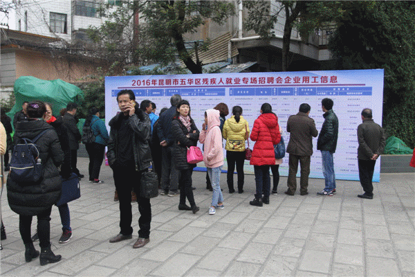 为缓解残疾人家庭就业难题,帮助残疾人和亲属就业,12月23日上午,五华区残联、区就业局共同举办“昆明市五华区2016年度残疾人及亲属(健全人)就业专场招聘会”。市残疾人就业中心主任李晓阳、区政府副区长期丽琼及相关部门领导和人员参加了招聘会启动仪式。