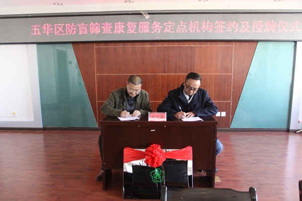 陈永谦理事长与被我区指定为防盲机构的昆明华山眼科医院王立副院长签订了2017年服务协议,并对防盲机构的服务项目进行介绍。