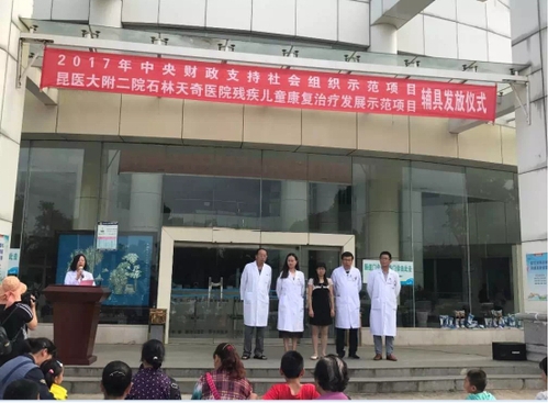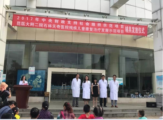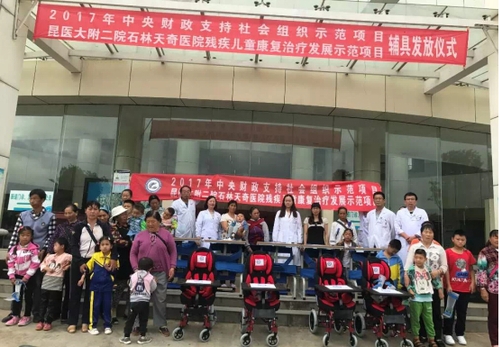 9月26日,残疾儿童康复治疗发展示范项目辅具发放仪式在昆医大附二院石林天奇医院隆重举行。石林县残疾人联合会理事长徐丽琼同志应邀参加了仪式,仪式由石林天奇医院副院长蔡菜同志主持,石林天奇医院领导班子、医院全体中层干部、20多名残疾小朋友及亲属共计76人参加了仪式。现场各位领导为20名残疾儿童发放了下肢矫形器、儿童康复站立架、儿童轮椅等辅具,总计金额35934元,让这些小朋友及其家属再次深深感受到政府和社会组织的关爱。