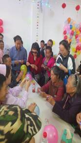 精神病患者在监护人陪同下自由发挥展示才艺表演,如:蒙眼画五官、吹气球、吹乒乓、折纸游戏等;在“端午节”到来之际共享传统美食。开展精防工疗活动对促进精神病患者康复起到积极重要的作用。(康复科供稿)