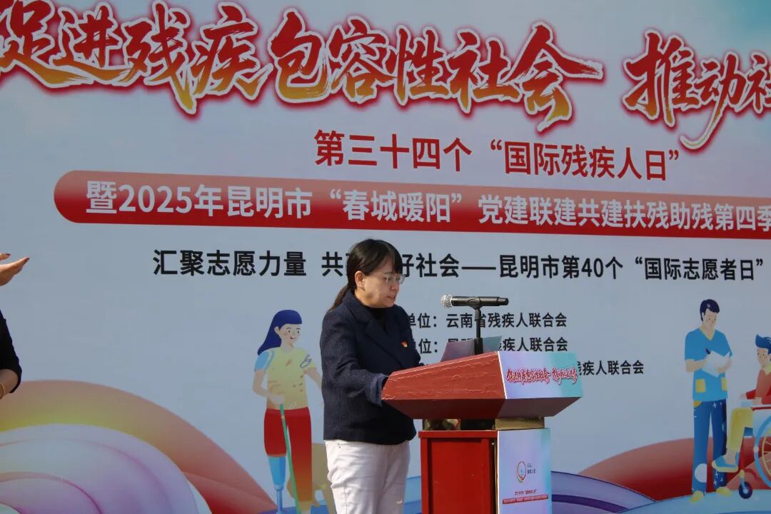 何云虹围绕党建引领残疾人事业高质量发展致辞。她表示,自2022年起,市残联联合市委组织部发起“春城暖阳”扶残助残党建联建共建工作,将残疾人工作从残联“单打独斗”的封闭小循环,转变为全社会广泛参与的开放大循环。这一做法得到了中国残联、省残联的充分肯定,实践案例通过《人民日报》头版、中国国际电视台走向全国、走向世界,让“春城暖阳”成为一个极具特色、极富温暖的党建品牌、民生品牌。