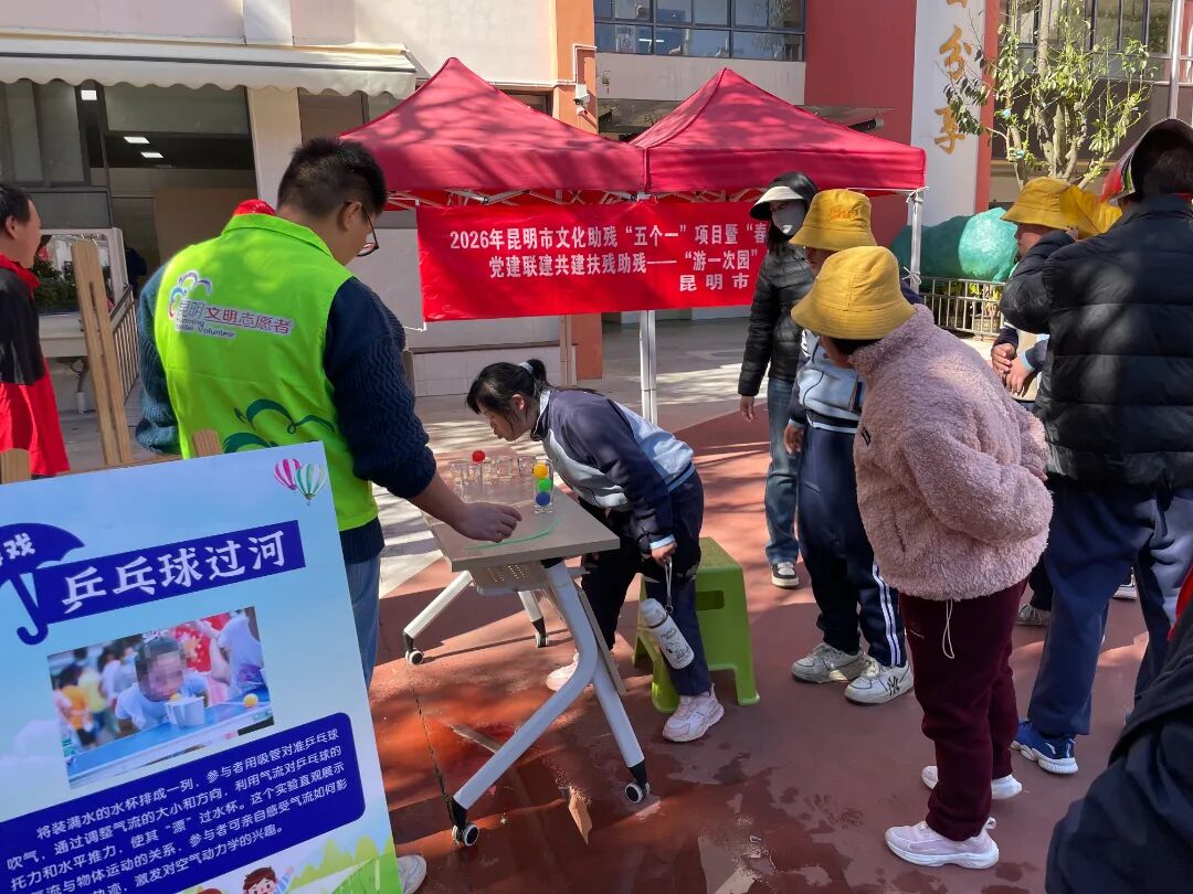 1月19日,昆明市残疾人联合会在盘龙区培智学校开展“春城暖阳”党建联建共建扶残助残“五个一”项目“游一次园”科普活动,全校150名残疾儿童分批次参与,在趣味科学实验中近距离感受科学魅力。