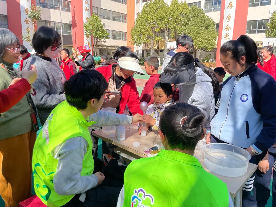本次活动设置乒乓球过河、魔法密信、泡泡接力赛、杯子蜡烛吸水、静电吸附、瓶子吹气球六个特色科学实验站,覆盖空气动力学、大气压强、静电、化学反应等基础科学知识。活动中,孩子们亲手操作实验器材,在吹气移球、显影密信、接力泡泡、趣味吸水等互动体验里,直观观察科学现象、感受科学原理,现场欢笑声、惊叹声不断,每个实验站前都洋溢着孩子们探索的热情。