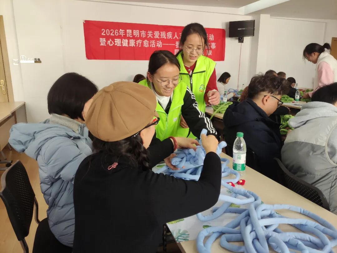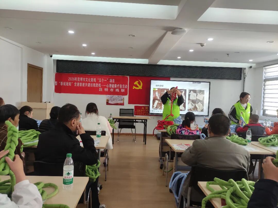 2月9日,昆明市“春城暖阳”党建联建共建扶残助残心理健康疗愈活动在盘龙区联盟街道金菊路社区举行。活动由市残疾人联合会主办、金菊路社区协办、市红嘴鸥青少年事务服务中心执行,以色彩心理学与手工编织为载体,为社区残疾人打造了一场兼具艺术体验与心理疏导的温情之旅。